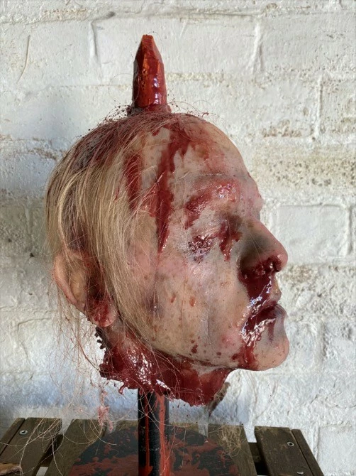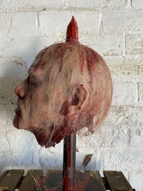 Life cast silicone head hand made and painted by a talented horror prop artist. A bloody stake comes out of the top of the head and it is supplied with a 5ft pole to mount the head on. It looks as if the stake goes through the head but dismantles for easy storage.