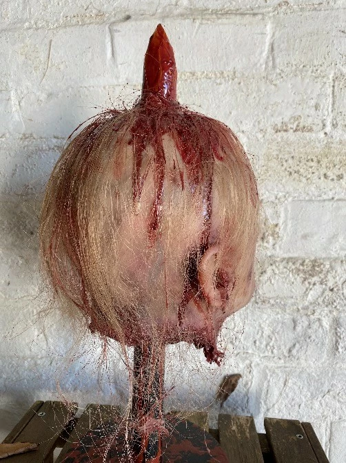 Super realistic with hand punched hair, this head is perfect for any butcher shop, serial killer or zombie themed attraction.