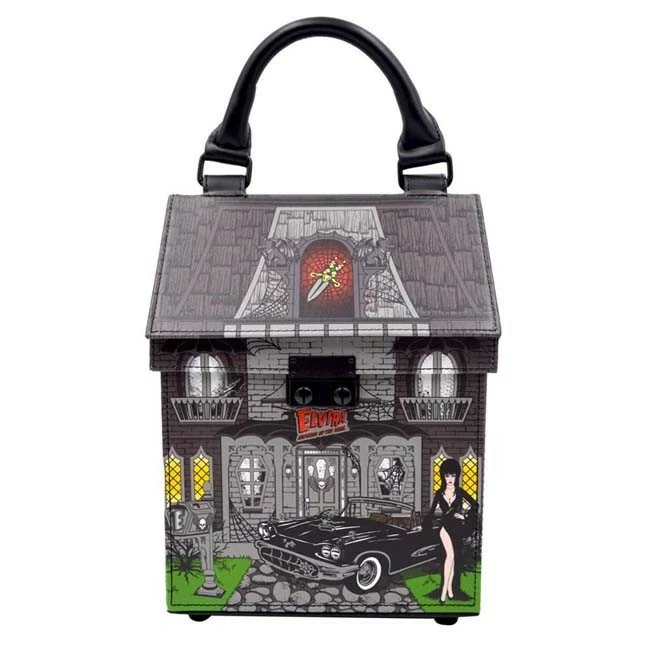 Did your aunt not leave you a haunted house in her will? Well now you can buy your own, with our officially licensed Elvira Haunted House Purse! Features Great-Aunt Morgana’s Mansion before and after the revamp. Front of the purse features the spooky and dark pre-vamp version of the manor. Back of the bag features the Elvira’s bright and colorful remodeling of the mansion!