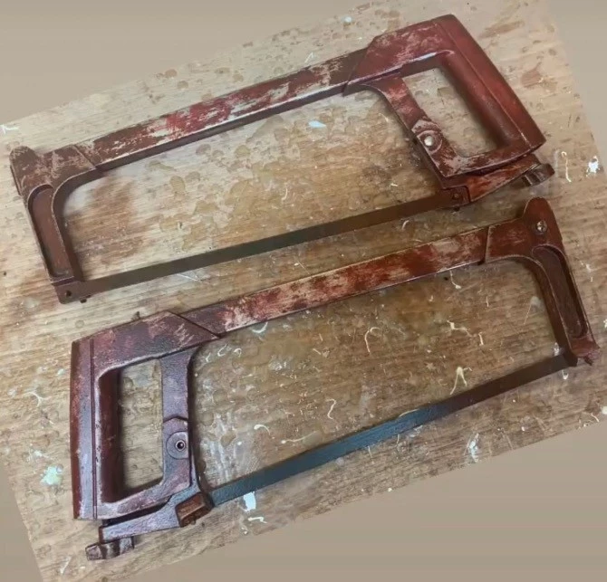 The hacksaw is made of aluminium but the blade is plastic for safety reasons (and blunt)
