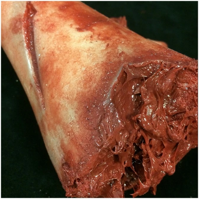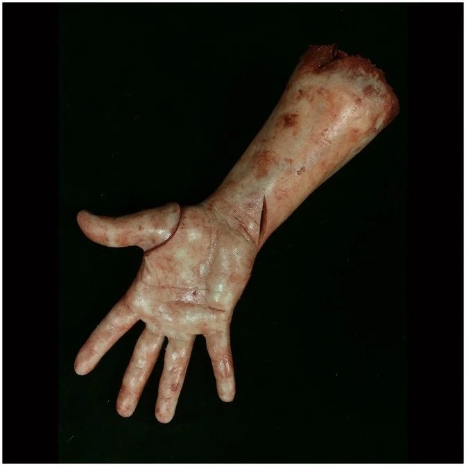 This severed male arm has solid silicone fingers and hand with a foam core in the forearm and silicone skinned. Highly detailed and film ready.