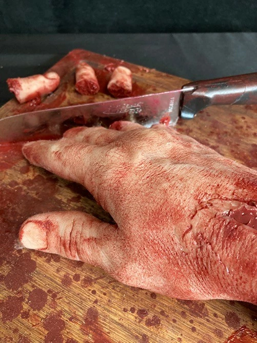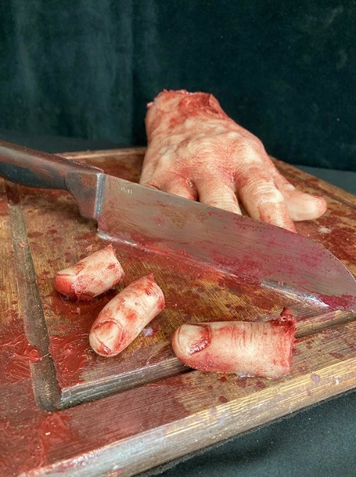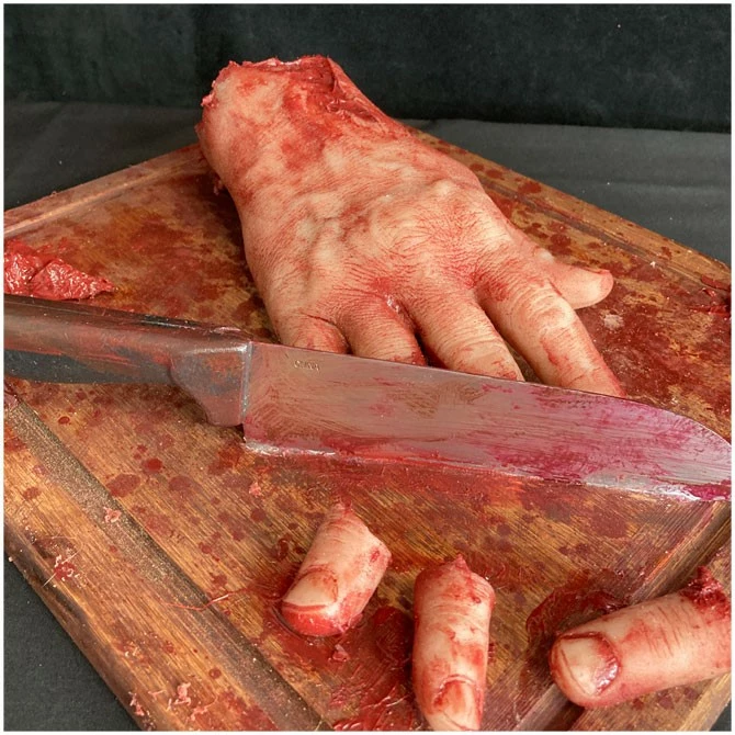 The hand is solid silicone and is mounted on a wooden cutting board. The knife is real, has been ‘dulled down’ and securely fastened to the wood.