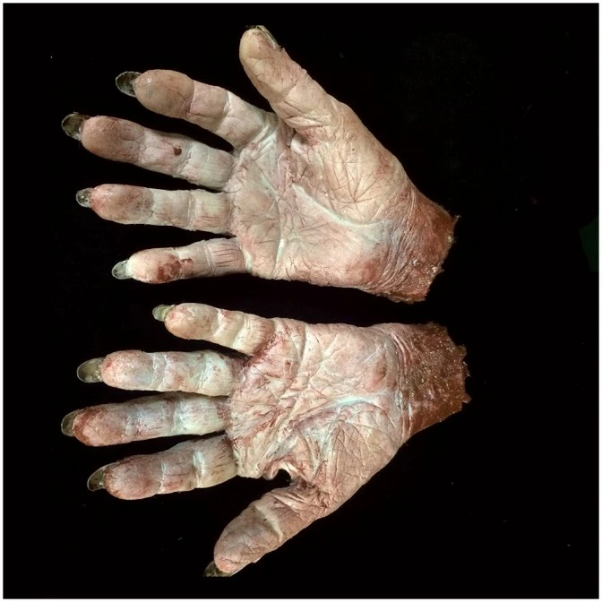 Crafted by a professional US horror artist, this silicone severed witches hand is a professional quality prop. Gnarly fingers and hideous nails.