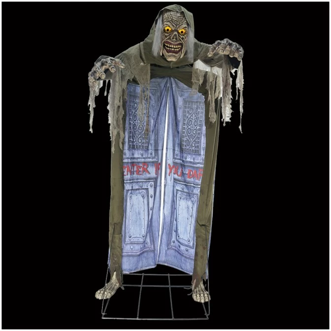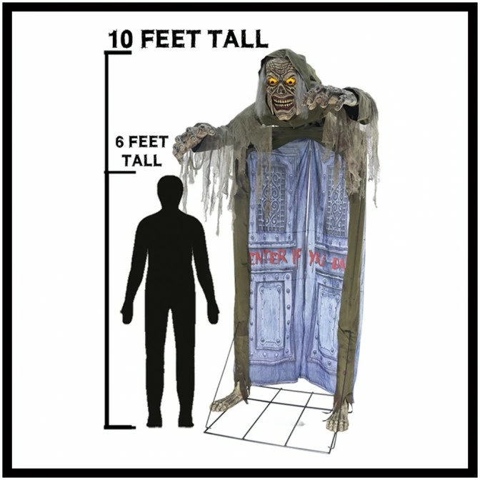 Here is a ghoulishly delightful Halloween door decoration! Standing at a colossal 10 feet tall, the looming ghoul animated walkthrough prop will wow your guests at your next haunted gathering!