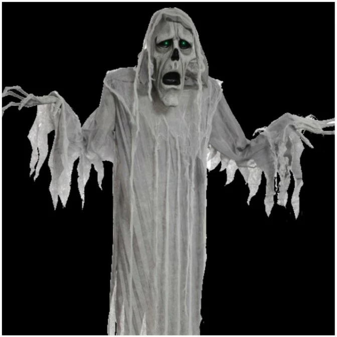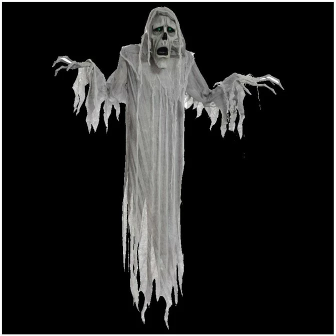 This 72-inch Hanging phantom life-sized prop has blow-moulded elongated head and hands with poseable arms, light-up eyes, and a tattered costume with hood and gauze details. There is a motion-sensor activation for the sounds he speaks, and there is a volume control. He makes creepy moaning sounds! Just the scary prop you need for your Halloween setting!