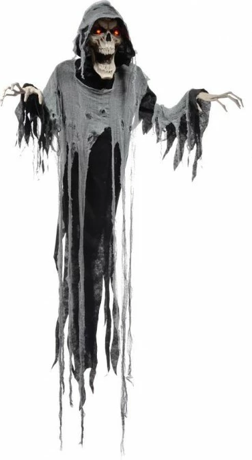 This 72-inch Hanging Reaper life-sized prop has blow-moulded elongated head and hands with poseable arms, light-up eyes, and a tattered costume with hood and gauze details! There is a motion-sensor activation to make him speak and there is even a volume control. Great for your Halloween party or setting!