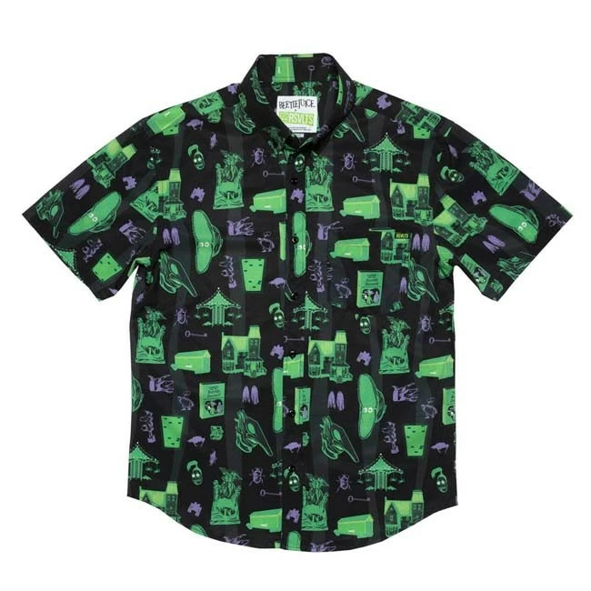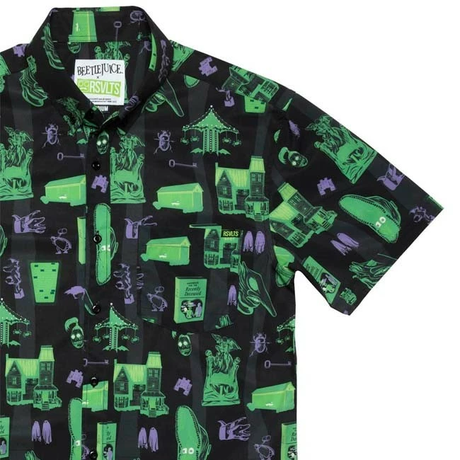 On this dark and eerie KUNUFLEX™ button down, you’ll find those new faces plus all the haunted happenings around the Maitland household and beyond, from shrunken heads to sandworms, the Handbook for the Recently Deceased to Beetlejuice’s grave.