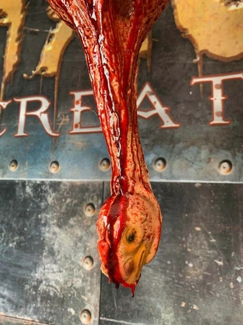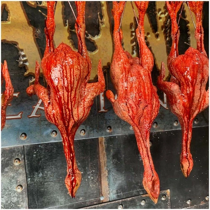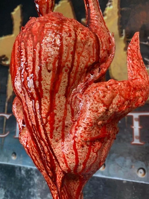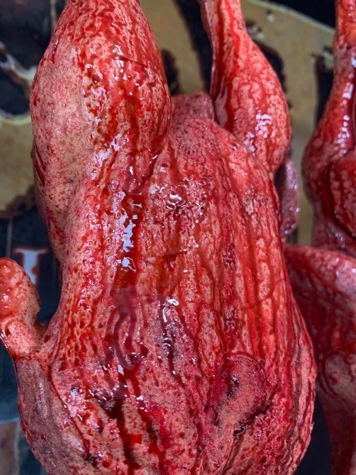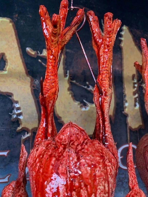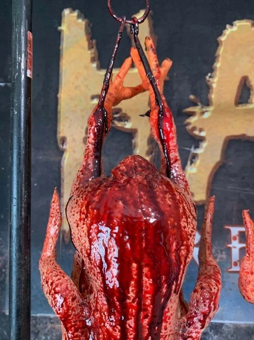 Carry around mobile prop for actors or can be hung as display. Life size bloody chicken. The blood is a urethane resin that permanent, will not bleed or fade and is flexible so it wont crack or break.