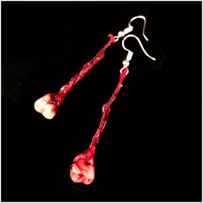 These handmade earrings are truly disgusting, looking like that have been freshly ripped from the jaw of a poor soul. With a nasty glossy finish they still look wet.