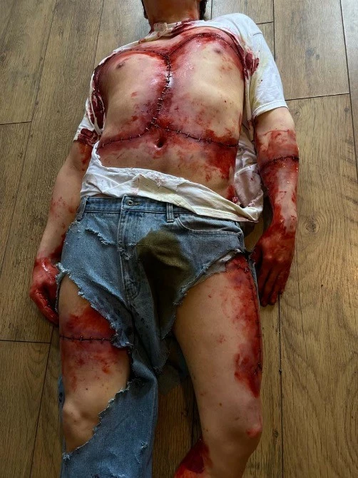 Life cast body, incredibly realistic with a high level of detail. Body has been chopped up and stitched back together.