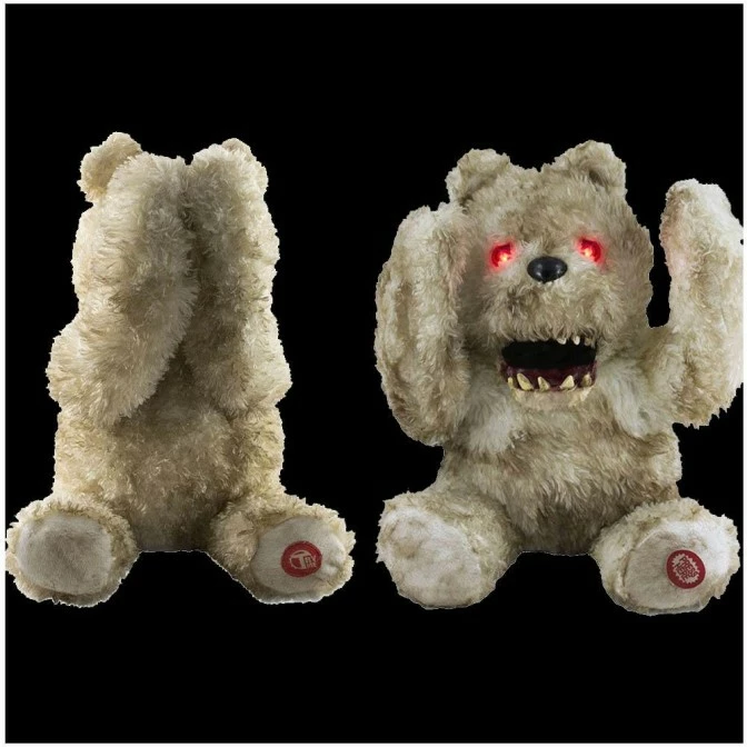 A super creepy teddy bear for Halloween! This cuddly bear looks cute hiding behind his arms but you soon find out he’s monstrous, revealing sharp teeth and evil, glowing eyes! Laughs maniacally and says 3 creepy phrases.