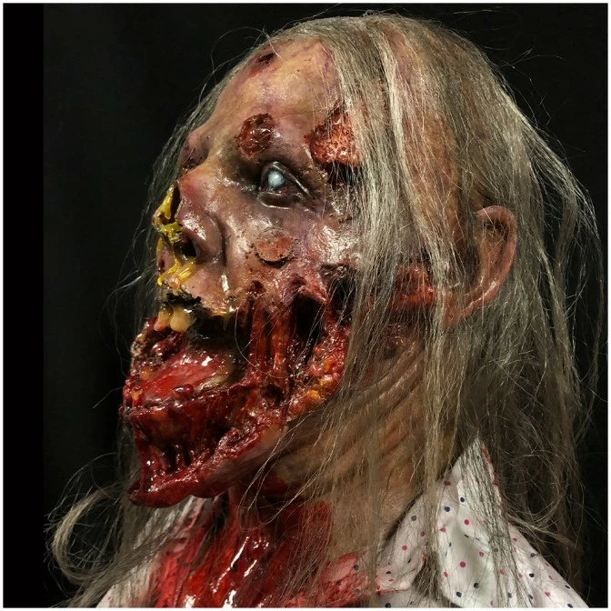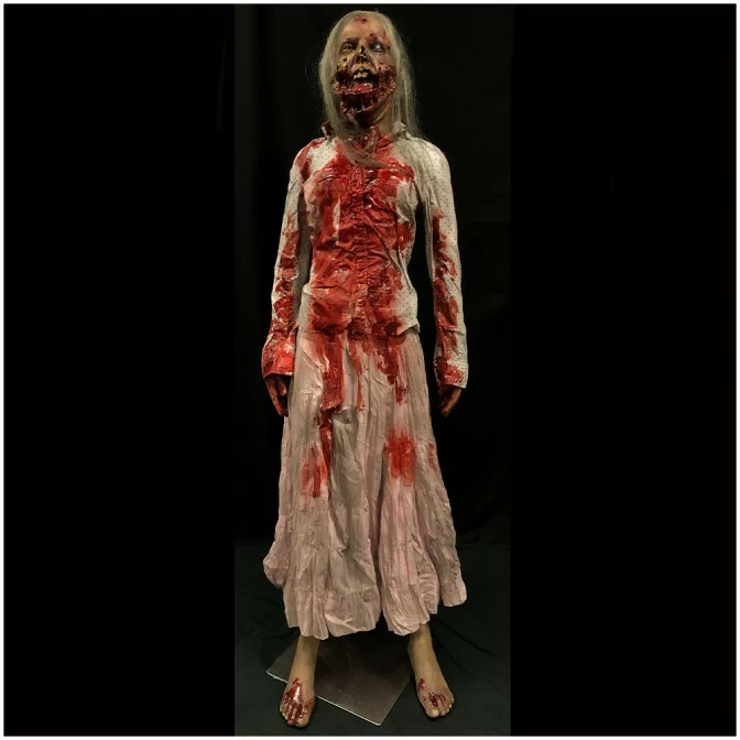 Life size super gory zombie woman. This life size prop has been designed and scuplted by an independent US artist especially for us at Mad About Horror. Sculpted and painted by hand the quality is exceptional.
