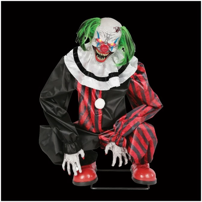 Very creepy clown crouches down and rocks side to side in a menacing way. His eyes light up and he has a sinister laugh, while nightmarish carnival music plays in the background.