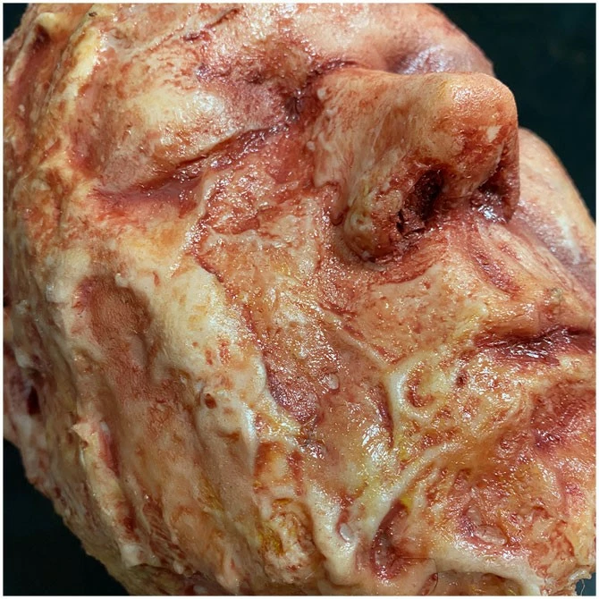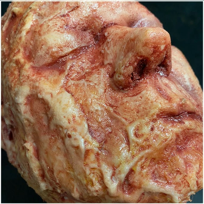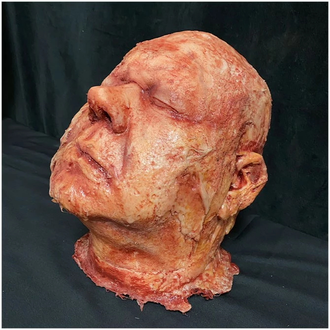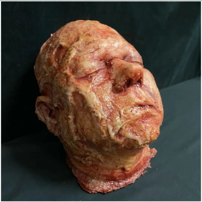 A hand made, life cast silicone head with high levels of detail and hand painted. He could have been burned in a fire or by acid. Suited to dystopian, laboratory or apocalytic themes.