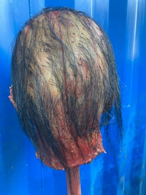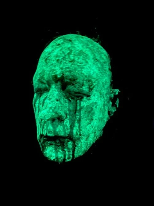 A highly detailed life cast head, hand moulded and painted. With hand punched hair and glow in the dark paint.