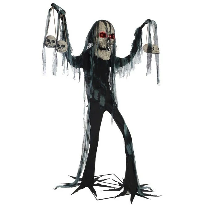 The shuddersome 7-foot Catacomb Creature animated prop features a giant creepy hooded oversized skull head with hinged jaw and red light-up eyes, a tattered black outfit with gray torn gauze fabric accents, and long spindly arms that hold four hanging jawless skulls dangling on hemp ropes.