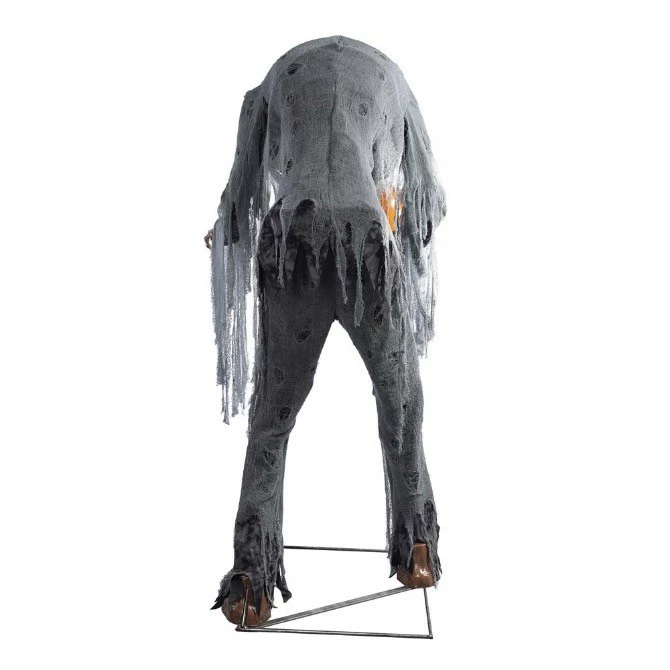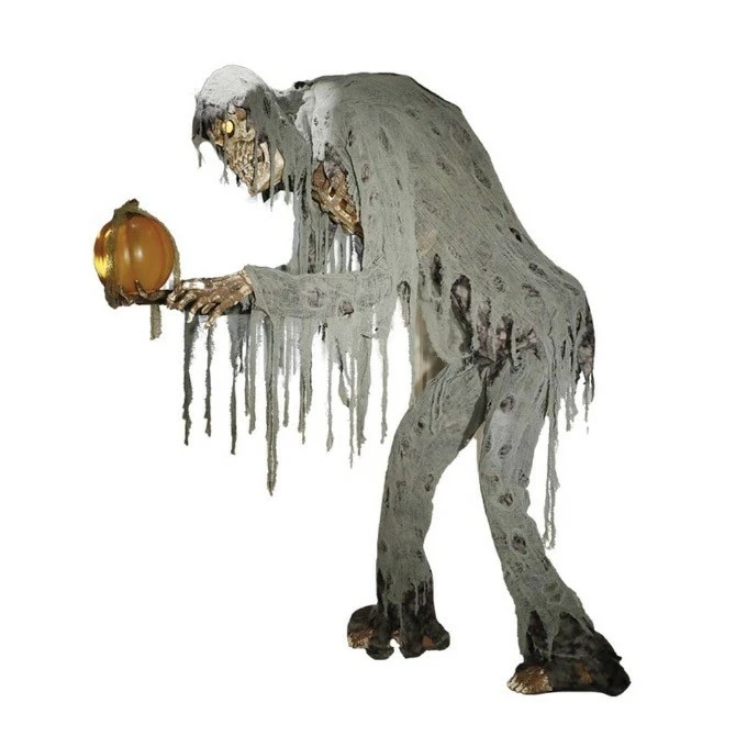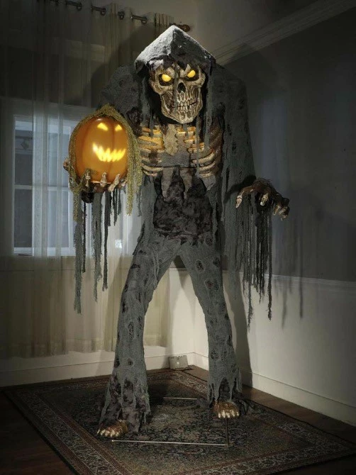 Prowling Jack Animated Prop is a Giant Skeletal Creature cloaked in rotting ragged ancient-looking clothingwhile he speaks in a menacing raspy Voice. Clutched in his right hand is a bright Orange Pumpkin with